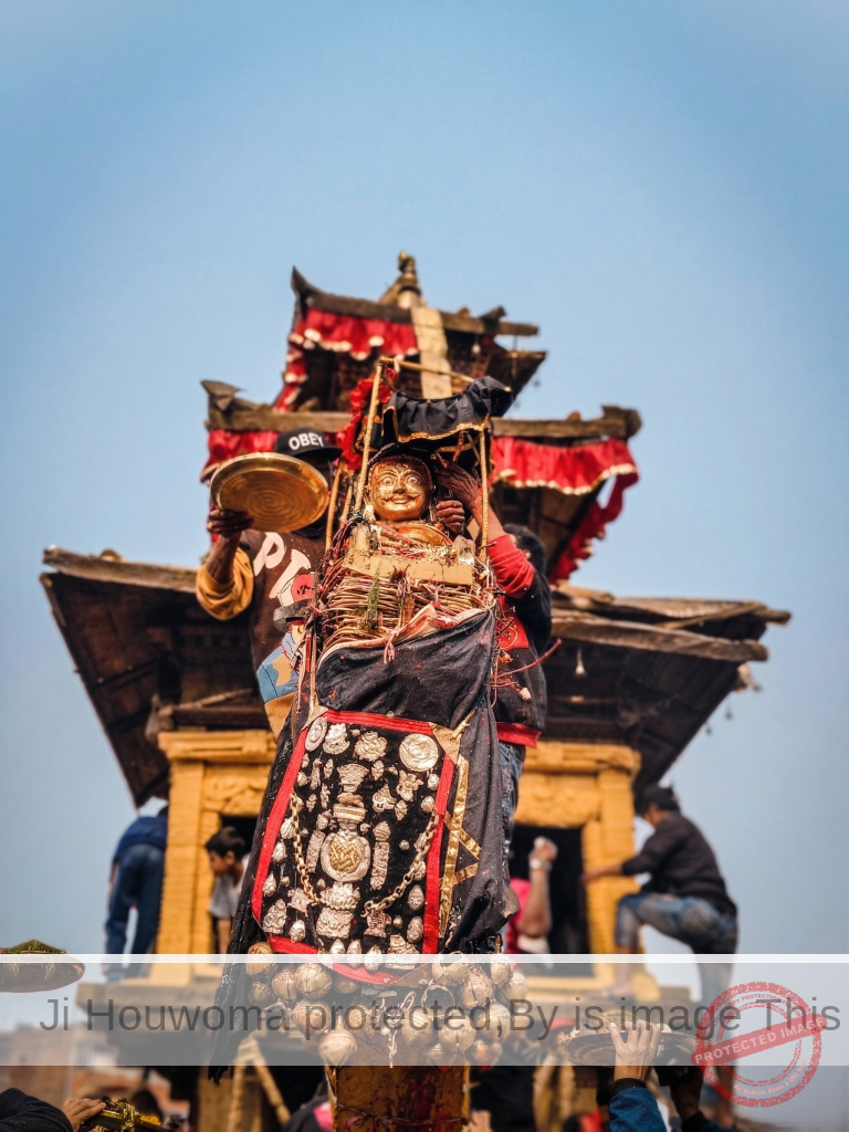 Location: Because the deity is typically kept “restrained” due to his mischievous disposition, he is associated with a special, secure courtyard (Beta Dyo Choke) within the Puba mansion, even though he is active during the Jatra in Taumadhi Square.