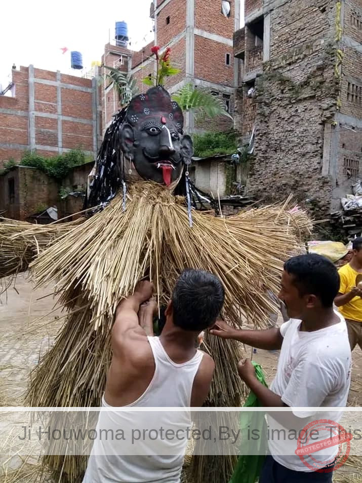 In Bhaktapur, the head of Poka-Tepa aka Gyampo (Earthen Pot-a substantial mound of clay) is made with a face resembling a monster, while hands and feet are made with Reeds, Chawali, and Straw. Hanging Pomelo as Balls and a Penis-shaped straw and reed creation called a Gathamuga is performed. Chawali is lit in the evening and transported outside the city to the Doka (Chaubato-Junctions ) where it is burned. Along the route, many melodies are rhythmically sung while burning.
