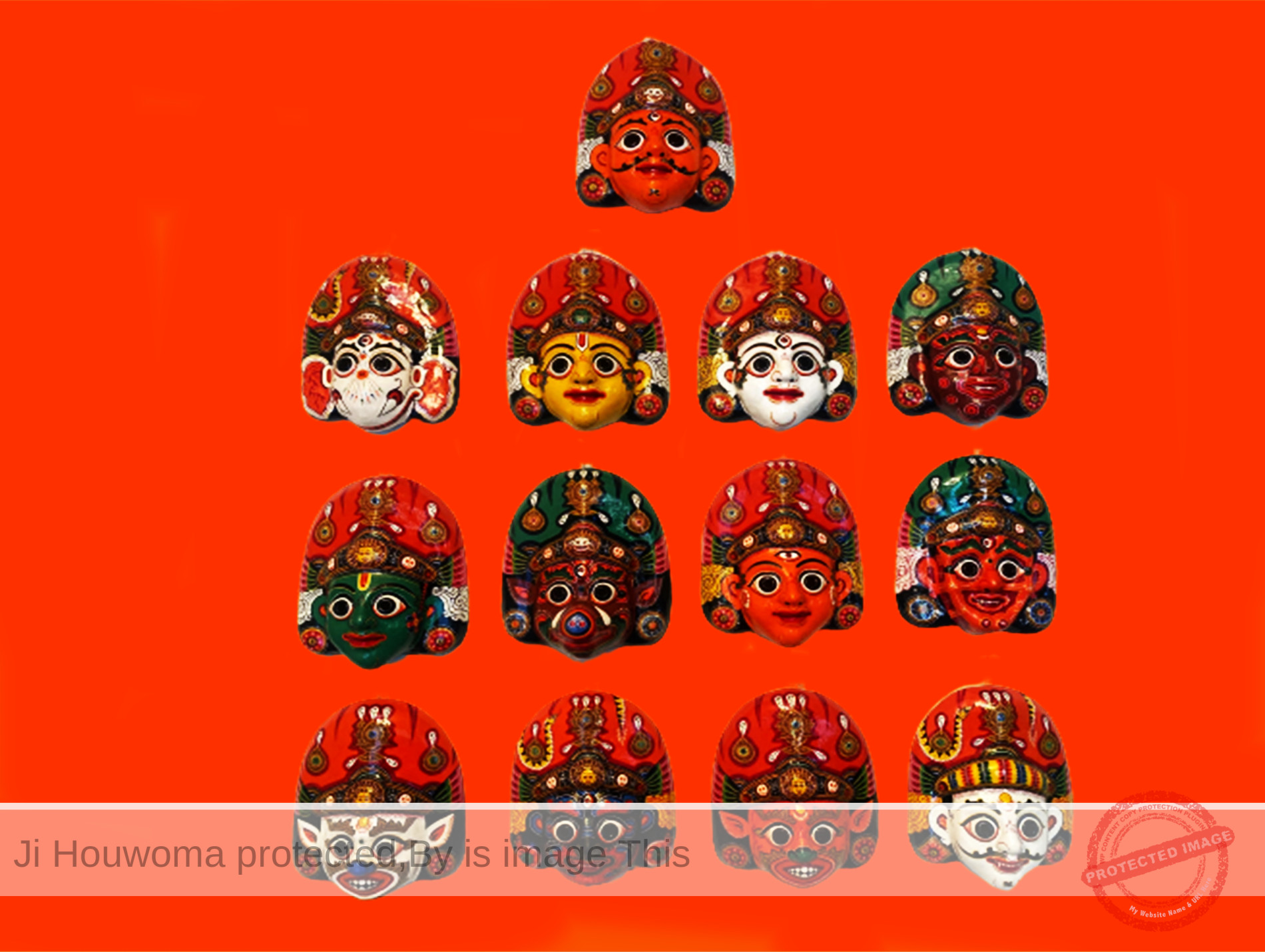 The Gana Nritya of Sree Navadurga Bhavani contains a total of 13 Mask. The mask of Shree Mahadev is not worn by living deities. However, there are 13 living Ganas present when Shree Navadurga Bhavani Nritya is worshiped, including Devanaki, Sifhadya, Patra, Khin, Tan, and Kanya.